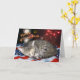 Tabby chat couché sur le drapeau avec feux d'artifice dans l'arrière - plan et texte "Happy 4 juillet"