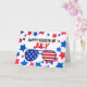Joyeuse carte de voeux patriotique du 4 juillet avec une paire de lunettes de soleil décorées d'étoiles et rayures du drapeau américain. Des étoiles rouges et bleues remplissent l'arrière - plan. Copyright © Shoaff Ballanger Studios, 2024.