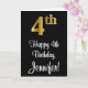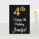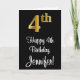 Ce design luxueux, élégant et sophistiqué de carte de voeux d'anniversaire comporte un grand numéro ordinal "4th" avec une imitation/faux look d'inspiration or, en plus du message de voeux d'anniversaire "Happy 4th Birthday", et un nom modifiable dans une police de style script sur le devant. Il a également un arrière - plan noir à l'avant. L'intérieur a un message de voeux d'anniversaire customisé, ou peut-être peut-être être effacé et laissé vide si un message doit être écrit à la main à la place. Une carte de voeux d’anniversaire stylisée et personnalisée comme celle-ci pourrait être utilisée pour célébrer le quatrième anniversaire de quelqu’un. [~Z0000518]