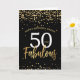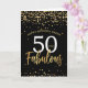 Carte d'anniversaire moderne 50 ans et fabuleuse. Ce design élégant présente une typographie en or et blanc sur fond noir et des confettis dorés. Personnalisez avec un nom sur le devant et votre message à l'intérieur.