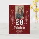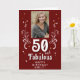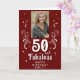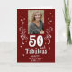 50 et Fabulous Foliage Rouge 50e Carte photo d'anniversaire. 50 et texte fabuleux en écriture blanche tendance avec un nom et feuillage blanc sur un arrière - plan rouge foncé. Personnalisez-le avec votre photo, votre nom et l'âge. Ajoutez votre texte à l'intérieur de la carte ou effacez-le.
