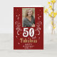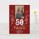 50 et Fabulous Foliage 50e anniversaire Carte photo. 50 et texte fabuleux en écriture blanche tendance avec un nom et feuillage blanc sur un arrière - plan rouge. Personnalisez-le avec votre photo, votre nom et l'âge. Ajoutez votre texte à l'intérieur de la carte ou effacez-le.