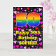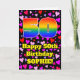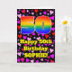 L'avant de cette carte de voeux d'anniversaire joyeuse et joyeuse dispose d'un grand nombre de "50" ayant un motif inspiré par un gradient de spectre arc-en-ciel. Il comporte également le message "Joyeux 50e anniversaire", et un nom personnalisé. L'arrière - plan de l'avant présente un motif de formes cardiaques aux couleurs comme le rouge, le rose et le violet. L'intérieur a un message d'anniversaire personnalisé, ou peut-être peut-être être effacé et laissé vide si un message doit être écrit à la main à la place. Une carte de voeux d’anniversaire amusante et modifiable comme celle-ci pourrait être utilisée pour souligner le cinquantième anniversaire de quelqu’un. [~Z0000551]