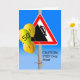 ATTENTION : Descendre À L'Avance. Au-dessus de la carte de voeux de 50e anniversaire de la colline. La carte papier est munie d'un panneau de dépose en pente raide sur un poteau en aluminium muni de ballons jaunes de prudence. Copyright © Shoaff Ballanger Studios.