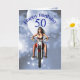 Une belle fille à moto à travers les étoiles dans le ciel. Une carte d'anniversaire très différente pour l'homme qui aime la moto !