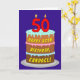 La façade de cette carte de voeux d'anniversaire joyeuse et optimisée présente une représentation d'un gâteau d'anniversaire à trois niveaux avec des bougies en forme de numéro sur le dessus montrant l'âge "50", avec le message "HAPPY 50TH BIRTHDAY", et un nom de destinataire personnalisé. L'intérieur a un message d'anniversaire personnalisé, ou peut-être peut-être être effacé et laissé vide si un message doit être écrit à la main à la place. Une carte de voeux d'anniversaire joyeuse et personnalisée comme celle-ci pourrait être une façon amusante de faire des voeux d'anniversaire à quelqu'un qui célèbre son cinquantième anniversaire. [~Z0000620]