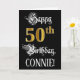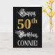 La façade de cette carte de voeux fantaisie et formelle d'anniversaire comporte le message "Joyeux 50e anniversaire", ainsi qu'un nom de destinataire personnalisable. Une partie du message est dans un texte élégant de style script, le grand numéro "50th" dispose d'un faux/imitation motif de look d'inspiration or, et l'arrière - plan est de couleur noire. L'intérieur a un message de voeux d'anniversaire customisé, ou peut-être peut-être être effacé et laissé vide si un message doit être écrit à la main à la place. Une carte de voeux d’anniversaire luxueuse et personnalisée comme celle-ci pourrait être utilisée pour souligner le cinquantième anniversaire de quelqu’un. [~Z0000559]