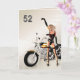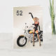52e anniversaire avec une moto. Une fille debout à côté d'une moto pointant vers le message Joyeux Anniversaire. La fille porte des talons et un basque. Elle est grande, mince et blonde. Une excellente carte pour l'homme qui aime ses motos !