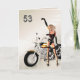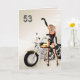 53ème anniversaire avec une moto. Une fille debout à côté d'une moto montrant le message Joyeux anniversaire. La fille porte des talons et une basque. Elle est grande, mince et blonde. Une grande carte pour l'homme qui aime ses vélos !