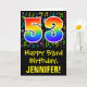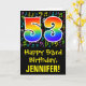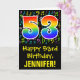 La face avant de cette carte de vœux d'anniversaire amusante, colorée et vibrante présente un grand nombre "53" avec un motif inspiré d'un dégradé de spectre d'arc-en-ciel, ainsi que le message "Joyeux 53e Anniversaire" et un nom de destinataire personnalisable. Le devant présente également un motif de diverses notes de musique et symboles de différentes couleurs et tailles. L'intérieur comporte un message de vœux d'anniversaire modifiable, ou pourrait éventuellement être effacé et laissé vierge si un message doit être écrit à la main à la place. Une carte d'anniversaire personnalisée comme celle-ci pourrait être un moyen amusant d'envoyer des vœux d'anniversaire à un musicien, chanteur, compositeur ou quelqu'un d'autre qui célèbre son cinquante-troisième anniversaire.