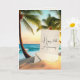 Un papier d'invitation vierge avec enveloppe repose sur une plage de sable sur fond de palmiers doucement balançants et d'un océan serein sous un soleil couchant vibrant pour le 55e anniversaire. Tout le texte peut être modifié.