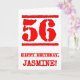 Cette carte de voeux amusante à thème d'anniversaire comporte un grand numéro rouge "56" ayant un look inspiré par un tampon, ainsi que le message de voeux d'anniversaire "HAPPY BANTHDAY", et un nom modifiable sur le devant. L'intérieur a un message de voeux d'anniversaire personnalisable, ou peut-être peut-être être effacé et laissé vide si un message doit être écrit à la main à la place. Une carte de voeux d'anniversaire amusante et modifiable comme celle-ci pourrait être une façon amusante de transmettre des voeux d'anniversaire à quelqu'un qui célèbre son cinquante-sixième anniversaire. [~Z0000524]