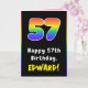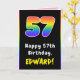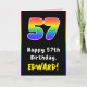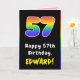 Cette carte de voeux joyeuse et optimisée sur le thème de l'anniversaire comprend un grand nombre de "57" ayant un motif multicolore inspiré du spectre arc-en-ciel, avec le message "Happy 57th Birthday," et un nom de destinataire personnalisable. L'intérieur comporte un message de voeux d'anniversaire personnalisable, ou peut-être pourrait-il être effacé et laissé vide si un message doit être écrit à la main à la place. Une carte de voeux d'anniversaire amusante et personnalisable comme celle-ci pourrait être une façon amusante de livrer des voeux d'anniversaire à quelqu'un qui célèbre son cinquante-septième anniversaire. [~Z0000627]