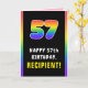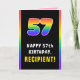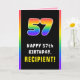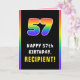 Cette carte de voeux amusante et joyeuse sur le thème de l'anniversaire comprend un grand nombre de "57" ayant un motif multicolore de spectre arc-en-ciel inspiré de dégradé, avec le message "HAPPY 57th BIRTHDAY,", et un nom de destinataire personnalisé. L'intérieur comporte un message de voeux d'anniversaire customisé, ou peut-être pourrait-il être effacé et laissé vide si un message doit être écrit à la main à la place. Une carte de voeux d’anniversaire joyeuse et personnalisable comme celle-ci pourrait être utilisée pour célébrer le cinquante-septième anniversaire de quelqu’un. [~Z0000636]