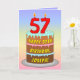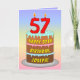 Cette carte de voeux joyeuse et colorée à thème d'anniversaire présente une représentation de dessin animé d'un gâteau d'anniversaire à trois niveaux avec des bougies en forme de chiffre sur le dessus montrant l'âge de "57", avec le message "HAPPY 57TH BIRTHDAY", et un nom de destinataire personnalisé. L'arrière - plan de l'avant a un motif multicolore pastel en arc-en-ciel inspiré du spectre dégradé. L'intérieur comporte un message de voeux d'anniversaire personnalisable, ou peut-être pourrait-il être effacé et laissé vide si un message doit être écrit à la main à la place. Une carte de voeux optimiste et personnalisable comme celle-ci pourrait être envoyée pour célébrer le cinquante-septième anniversaire de quelqu’un. [~Z0000625]