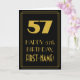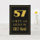Cette carte de vœux à l'occasion d'un anniversaire de style vintage/rétro inspirée des années 1920/1930 présente un grand numéro « 57 » de style art déco, le message « Joyeux 57e anniversaire », un nom modifiable et un motif de bordure composé de fines lignes sur le devant. Le devant présente un fond de couleur noire. L'intérieur contient un message de vœux d'anniversaire personnalisable, ou pourrait éventuellement être effacé et laissé vide si un message doit être écrit à la main à la place. Une carte de vœux d'anniversaire personnalisée comme celle-ci pourrait être envoyée pour célébrer le cinquante-septième anniversaire de quelqu'un.