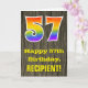 L'avant de cette carte de voeux d'anniversaire colorée mais rustique dispose d'un grand nombre de "57" ayant un motif inspiré par un gradient de spectre arc-en-ciel. Il comporte également le message "Joyeux 57e anniversaire", et un nom de destinataire personnalisé. L'avant est ornée d'un arrière - plan représentant un motif rustique d'inspiration simili-bois. L'intérieur comporte un message de voeux d'anniversaire personnalisable, ou peut-être pourrait-il être effacé et laissé vide si un message doit être écrit à la main à la place. Une carte d’anniversaire personnalisable comme celle-ci pourrait être une façon amusante de reconnaître le cinquantenaire de quelqu’un. [~Z0000419]