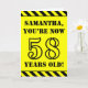 Le devant de cette carte de voeux amusante et audacieuse à thème d’anniversaire comporte un nom personnalisé et le message "VOUS AVEZ MAINTENANT 58 ANS !" en texte de style pochoir noir sur un arrière - plan de couleur jaune. L'avant est également orné d'un motif rayé noir et jaune accrocheur aux bords supérieur et inférieur. L'intérieur comporte un message de voeux d'anniversaire personnalisable, ou peut-être pourrait-il être effacé et laissé vide si un message doit être écrit à la main à la place. Une carte d'anniversaire personnalisée comme celle-ci pourrait être une façon amusante d'envoyer des voeux d'anniversaire à quelqu'un qui célèbre son cinquante-huitième anniversaire. [~Z0000413]