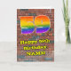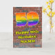 Cette conception de carte de vœux d'anniversaire excitante et vibrante inspirée de l'art de rue urbain et du graffiti présente un grand nombre « 59 » avec un motif dégradé de spectre d'arc-en-ciel coloré, ainsi que le message « Joyueux 59e anniversaire », et un nom modifiable. Le fond de la face avant présente un motif de mur de briques. L'intérieur comporte un message de vœux d'anniversaire personnalisé, ou pourrait éventuellement être effacé et laissé vierge si un message doit être écrit à la main à la place. Une carte de vœux d'anniversaire colorée et modifiable comme celle-ci pourrait être utilisée pour souhaiter un joyeux anniversaire à quelqu'un qui fête son cinquante-neuvième anniversaire.
