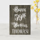 Le devant de cette carte de voeux formelle et élaborée sur le thème de l'anniversaire comporte le message "Joyeux 59ème anniversaire", en texte orné de style script. L'avant comporte également un nom de destinataire personnalisé, et un arrière - plan motif d'apparence imitation bois. L'intérieur a un message de voeux d'anniversaire personnalisable, ou peut-être peut-être être effacé et laissé vide si un message doit être écrit à la main à la place. Une carte de voeux d’anniversaire de style fantaisie et modifiable comme celle-ci pourrait être envoyée pour célébrer le cinquante-neuvième anniversaire de quelqu’un. [~Z0000556]