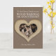 carte photo de 5e anniversaire de mariage de bois. Customisez cette carte d'anniversaire en bois hué brun coeur 5e mariage avec votre relation, photo et années de mariage, et message de carte intérieure. Voici l'exemple : À nos amis les plus chers à l'occasion de votre anniversaire de Mariage de bois du 25 mai 2024 à 2029. Art et design en coeur sculpté en bois par Sarah Trett pour www.mylittleeden.com