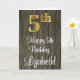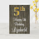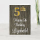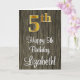Ce design sophistiqué, élégant et luxueux de carte de voeux d'anniversaire comporte un grand numéro ordinal "5th" ayant un look faux/imitation or, en plus du message de voeux d'anniversaire "Happy 5th Birthday", et un nom personnalisé dans une police de style script sur le devant. L'arrière - plan du devant a un motif d'inspiration imitation bois. L'intérieur a un message de voeux d'anniversaire personnalisable, ou peut-être peut-être être effacé et laissé vide si un message doit être écrit à la main à la place. Une carte de voeux d’anniversaire élégante et modifiable comme celle-ci pourrait être envoyée pour célébrer le cinquième anniversaire de quelqu’un. [~Z0000519]