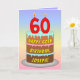 Cette carte de voeux joyeuse et optimisée à thème d'anniversaire présente une représentation de type dessin animé d'un gâteau d'anniversaire à trois niveaux avec des bougies en forme de numéro sur le dessus montrant l'âge "60", avec le message "HAPPY 60TH BIRTHDAY," et un nom de destinataire personnalisable. L'arrière - plan du devant a un motif multicolore pastel en arc-en-ciel inspiré du spectre dégradé. L'intérieur comporte un message de voeux d'anniversaire personnalisable, ou peut-être pourrait-il être effacé et laissé vide si un message doit être écrit à la main à la place. Une carte de voeux d’anniversaire colorée et personnalisée comme celle-ci pourrait être envoyée pour célébrer le soixantième anniversaire de quelqu’un. [~Z0000625]