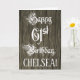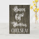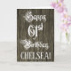 L'avant de cette carte de vœux d'anniversaire au thème élégant et formel présente le message « Joyeux 61e anniversaire » dans un texte de style calligraphié opulent. L'avant comporte également un nom de destinataire personnalisé et un motif de fond inspiré d'un faux bois. L'intérieur contient un message de vœux d'anniversaire modifiable ou pourrait éventuellement être vidé et laissé vierge si un message doit être écrit à la main à la place. Une carte de vœux d'anniversaire élégante et modifiable comme celle-ci pourrait être utilisée pour reconnaître le soixante-et-unième anniversaire de quelqu'un.