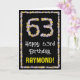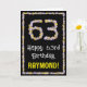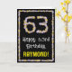 La façade de cette carte de voeux amusante et inspirée de la nature, porte le message "Joyeux 63e anniversaire", ainsi qu'un nom de destinataire personnalisable. Le grand numéro "63" plus la bordure à l'avant sont tous deux dotés d'icônes de fleurs. L'intérieur a un message de voeux d'anniversaire customisé, ou peut-être peut-être être effacé et laissé vide si un message doit être écrit à la main à la place. Une carte de voeux d'anniversaire fleurie et personnalisée comme celle-ci pourrait être une façon amusante d'envoyer un message d'anniversaire à quelqu'un qui célèbre son soixante-troisième anniversaire. [~Z0000648]