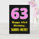 Cette carte de voeux amusante et joyeuse à thème d'anniversaire design dispose d'un grand numéro "63" avec un motif rayé contenant des formes cardiaques coloré rose clair et rose foncé sur l'avant. Le recto contient également le message de voeux d'anniversaire "Joyeux 63e anniversaire", ainsi qu'un nom de destinataire modifiable. L'intérieur comporte un message de voeux d'anniversaire personnalisé, ou peut-être pourrait-il être effacé et laissé vide si un message doit être écrit à la main à la place. Une carte d’anniversaire personnalisable comme celle-ci pourrait être une façon amusante de souligner le soixante-troisième anniversaire de quelqu’un. Ce pourrait aussi être un choix amusant pour quelqu'un qui a un anniversaire qui tombe le 14 février (Saint-Valentin), en raison de ses symboles et couleurs de coeur aimés. [~Z0000434]