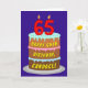 Cette carte de voeux optimiste et joyeuse, sur le thème de l'anniversaire, présente une représentation d'un gâteau d'anniversaire à trois niveaux avec des bougies en forme de chiffre sur le dessus montrant le numéro "65", ainsi que le message "HAPPY 65TH BIRTHDAY", et un nom de destinataire personnalisable. L'intérieur comporte un message d'anniversaire personnalisé, ou pourrait être effacé et laissé vide si un message doit être écrit à la main à la place. Une carte de voeux d'anniversaire joyeuse et customisée comme celle-ci pourrait être une façon amusante de faire des voeux d'anniversaire à quelqu'un qui célèbre son soixante-cinquième anniversaire. [~Z0000620]