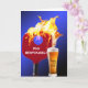 Pagaie rouge à boule de pickleball avec boule bleue en flammes et verre de bière sur un arrière - plan bleu vif pour 65ème anniversaire. La couleur Arrière - plan peut être modifiée. L'âge d'anniversaire peut être modifié. Tout le texte est modifiable.
