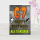 Le devant de cette carte de voeux d'anniversaire à thème Halloween éffrayant et effrayant comporte un grand nombre de "67". Il comporte également le message "HAPPY BANTHDAY," et un nom personnalisé. Il y a aussi des représentations d'une chauve-souris et d'un fantôme sur le devant. L'intérieur comporte un message de voeux d'anniversaire customisé, ou peut-être pourrait-il être effacé et laissé vide si un message doit être écrit à la main à la place. Une carte d'anniversaire personnalisée comme celle-ci pourrait être une façon amusante d'envoyer des voeux d'anniversaire à quelqu'un qui célèbre son soixante-septième anniversaire et qui est également né à Halloween (31 octobre). [~Z0000547]