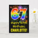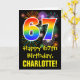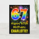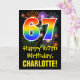 La face avant de cette carte de vœux d'anniversaire amusante, colorée et excitante présente un grand nombre "67" avec un motif inspiré du dégradé du spectre de l'arc-en-ciel, ainsi que le message "Joyeux 67e Anniversaire" et un nom de destinataire modifiable. L'avant présente également un motif de fond coloré inspiré de l'apparence de feux d'artifice de célébration éclatants. L'intérieur comporte un message de vœux d'anniversaire personnalisé, ou pourrait éventuellement être effacé et laissé vide si un message doit être écrit à la main à la place. Une carte d'anniversaire personnalisable comme celle-ci pourrait être un moyen amusant de souhaiter un joyeux anniversaire à quelqu'un pour son soixante-septième anniversaire. [~Z0000442]
