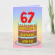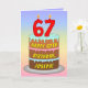 This joyful and colorful birthday themed greeting card design objets a cartoon-style depiction of a three-tier birthday cake having numeral-shaped candles on top showing the number "67", along with the message "HAPPY 67TH BIRTHDAY," et a customizization able recipient name The background of the front has a multicolored pastel rainbow spectrum inspecred gradient. The inside fean editable birthday greeting message, or could perhaps be cleared and left blank if a message is to be written by hand instead. An upbeat, editable birthday greeting card like this might be a fun way to deliver birthday greetings to somebody who is celebrating their sixty-seventh birthday. 2