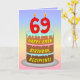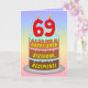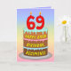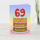 Cette carte de voeux amusante et colorée à thème d'anniversaire présente une représentation de dessin animé d'un gâteau d'anniversaire à trois niveaux avec des bougies en forme de chiffres sur le dessus montrant le numéro "69", avec le message "HAPPY 69TH BIRTHDAY", et un nom de destinataire personnalisé. L'arrière - plan du devant a un motif multicolore pastel en arc-en-ciel inspiré du spectre dégradé. L'intérieur a un message de voeux d'anniversaire personnalisé, ou peut-être peut-être être effacé et laissé vide si un message doit être écrit à la main à la place. Une carte de voeux d'anniversaire joyeuse et personnalisable comme celle-ci pourrait être une façon amusante de délivrer des voeux d'anniversaire à quelqu'un qui célèbre son soixante-neuvième anniversaire. [~Z0000625]