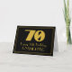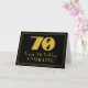 Cette carte de voeux inspirée de l'époque des Années folles et de style vintage est décorée d'un grand style art déco inspiré du numéro "70", du message "Happy 70th Birthday", un nom personnalisé, et d'un motif frontalier composé de lignes fines sur le devant. L'arrière - plan du devant est noir de couleur. L'intérieur a un message de voeux d'anniversaire customisé, ou peut-être peut-être être effacé et laissé vide si un message doit être écrit à la main à la place. Une carte de voeux d’anniversaire personnalisée comme celle-ci pourrait être utilisée pour souligner le soixante-dixième anniversaire de quelqu’un. [~Z0000498]