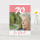Carte de voeux personnalisée pour 70e anniversaire pour quelqu'un célébrant 70e anniversaire. Il est livré avec une citation drôle et motivationnelle 70 So What! et est parfait pour une personne avec un sens de l'humour. La carte est en rose et blanc. Insérez votre photo dans le modèle. Vous pouvez également modifier le numéro d'année.