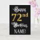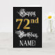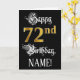 Le recto de cette carte de voeux élaborée et luxueuse à thème d'anniversaire comporte le message "Joyeux 72e anniversaire", ainsi qu'un nom de destinataire personnalisable. Une partie du message est dans un texte élégant de style script, le grand numéro "72nd" dispose d'un faux/imitation motif de look d'inspiration or, et l'arrière - plan est de couleur noire. L'intérieur a un message de voeux d'anniversaire personnalisé, ou peut-être peut-être être effacé et laissé vide si un message doit être écrit à la main à la place. Une carte de voeux d'anniversaire formelle et personnalisée comme celle-ci pourrait être une façon respectable d'envoyer des voeux d'anniversaire à quelqu'un qui célèbre son soixante-douzième anniversaire. [~Z0000559]