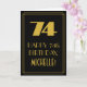 Le devant de cette carte de vœux d'anniversaire de style vintage présente un grand numéro « 74 » inspiré du style art déco, le message « Joyeux 74e anniversaire », un nom personnalisé et un motif de bordure composé de lignes. Le devant présente également un fond de couleur noire. L'intérieur contient un message de vœux d'anniversaire personnalisé, ou pourrait éventuellement être laissé vierge si un message doit être écrit à la main à la place. Une carte d'anniversaire personnalisable comme celle-ci pourrait être un moyen amusant d'envoyer des vœux d'anniversaire à quelqu'un qui célèbre son soixante-quatorzième anniversaire.