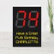 L'avant de cette carte de voeux ridicule et amusante à thème d'anniversaire comporte un grand numéro "74" avec une apparence rouge à sept segments d'affichage numérique, ainsi que le message "Avoir un grand 74e anniversaire", et un nom personnalisé, sur un arrière - plan de couleur noire. L'intérieur comporte un message de voeux d'anniversaire personnalisé, ou peut-être pourrait-il être effacé et laissé vide si un message doit être écrit à la main à la place. Une carte d'anniversaire comme celle-ci pourrait être une façon amusante d'envoyer des voeux d'anniversaire à quelqu'un qui célèbre son soixante-quatorzième anniversaire. [~Z0000386]