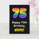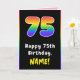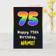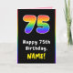 Ce design de carte de voeux d'anniversaire optimiste et gai comprend le numéro "75", doté d'un motif dégradé multicolore inspiré du spectre arc-en-ciel, ainsi que le message "Happy 75th Birthday," et un nom de destinataire personnalisé. L'intérieur a un message de voeux d'anniversaire personnalisable, ou peut-être peut-être être effacé et laissé vide si un message doit être écrit à la main à la place. Une carte de voeux d’anniversaire amusante et personnalisée comme celle-ci pourrait être envoyée pour célébrer le soixante-quinzième anniversaire de quelqu’un. [~Z0000627]