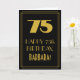 L'avant de ce design de carte de voeux d'anniversaire d'apparence vintage est décoré d'un grand style art déco inspiré du numéro "75", du message "HAPPY 75th BIRTHDAY", un nom personnalisé, et d'un motif de frontière composé de lignes. L'avant est également orné d'un arrière - plan noir. L'intérieur comporte un message de voeux d'anniversaire modifiable, ou peut-être pourrait-il être effacé et laissé vide si un message doit être écrit à la main à la place. Une carte d'anniversaire personnalisable comme celle-ci pourrait être une façon amusante d'envoyer des voeux d'anniversaire à quelqu'un qui célèbre son soixante-quinzième anniversaire. [~Z0000502]