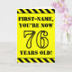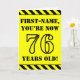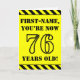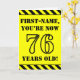 Le recto de cette carte de voeux d’anniversaire audacieuse et captivante comporte un nom personnalisé et le message "VOUS AVEZ MAINTENANT 76 ANS !" en texte de style pochoir noir sur un arrière - plan de couleur jaune. Il y a aussi un motif rayé noir et jaune accrocheur aux bords supérieur et inférieur de l'avant. L'intérieur comporte un message de voeux d'anniversaire customisé, ou peut-être pourrait-il être effacé et laissé vide si un message doit être écrit à la main à la place. Une carte d’anniversaire personnalisée comme celle-ci pourrait être une façon amusante d’envoyer un message pour célébrer le soixante-seizième anniversaire de quelqu’un. [~Z0000413]