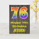La façade de cette carte de voeux d'anniversaire colorée mais rustique comporte un grand numéro "76" avec un motif inspiré par un gradient de spectre arc-en-ciel, ainsi que le message "Happy 76th Birthday," et un nom de destinataire personnalisé. L'avant est ornée d'un arrière - plan représentant un motif rustique de style simili bois. L'intérieur comporte un message de voeux d'anniversaire customisé, ou peut-être pourrait-il être effacé et laissé vide si un message doit être écrit à la main à la place. Une carte d’anniversaire personnalisée comme celle-ci pourrait être une façon amusante de célébrer le soixante-seizième anniversaire de quelqu’un. [~Z0000419]