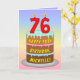 This cheerful and fun birthday-themed card greeting design objets a cartoon-style depiction of a three-tier birthday cake having number-shaped candles on top showing the age "76", along with the message "HAPPY 76TH BIRTHDAY," et a custom res The background of the front has a multi-color pastel rainbow spectrum inspigradient pattern. The inside has a personalized birthday greeting message, or could perhaps be cleared and left blank if a message is to be written by hand instead. A joyful, personalized birthday greeting card like this might be présente dans celebration of somebody’s seventy-sixth birthday. 2