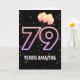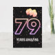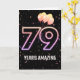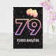Ballons de fête et confettis sur arrière - plan noir avec le néon numéro 79 pour un 79ème anniversaire.