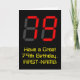 Le devant de cette conception de carte de vœux d'anniversaire idiote et geek comporte un grand nombre "79" avec une apparence de style d'affichage numérique à sept segments rouges, ainsi que le message "Joyeux 79e anniversaire," et un nom personnalisé, sur un fond de couleur noire. L'intérieur comporte un message d'anniversaire personnalisé ou pourrait éventuellement être effacé et laissé vide si un message doit être écrit à la main à la place. Une carte d'anniversaire personnalisable comme celle-ci pourrait être un moyen amusant de souhaiter un bon anniversaire à quelqu'un pour son soixante-dix-neuvième anniversaire.