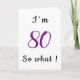 Une simple carte de voeux pour quelqu'un célébrant son 80e anniversaire. Il est accompagné d'une citation amusante I'm 80 alors quoi, et est parfait pour une personne avec un sens du humour.