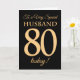 Une carte d'anniversaire chic 80e pour un "très spécial mari", avec un numéro 80 composé de numéros à effet or et le mot "mari", à effet or, sur un arrière - plan noir. Le message intérieur, que vous pouvez modifier si vous le souhaitez, est "Joyeux anniversaire"